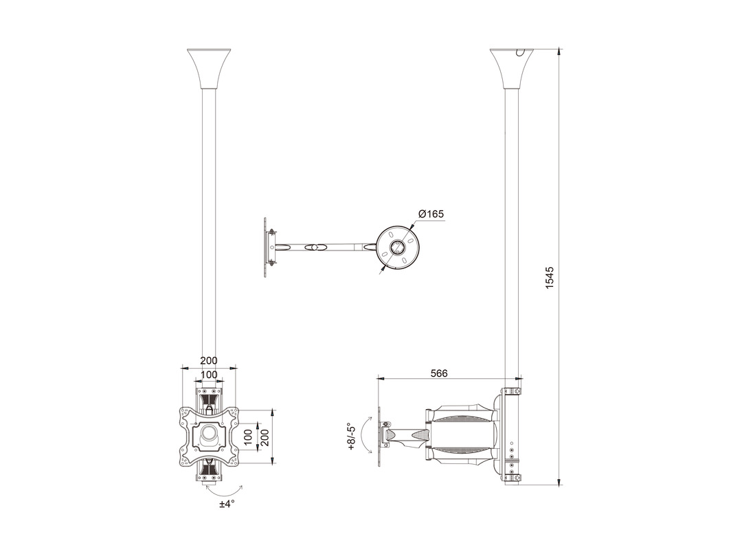 566mm Ausleger, neigbar bis 8°, Drehbar 360°, Kabelmanagement, 69x178x20cm,