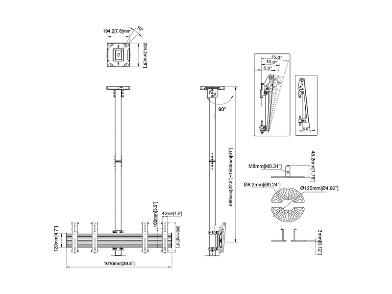 580mm-1550mm, Neigbar 15°, Drehbar 360°, Kabelmanagement, 101x20x13cm,