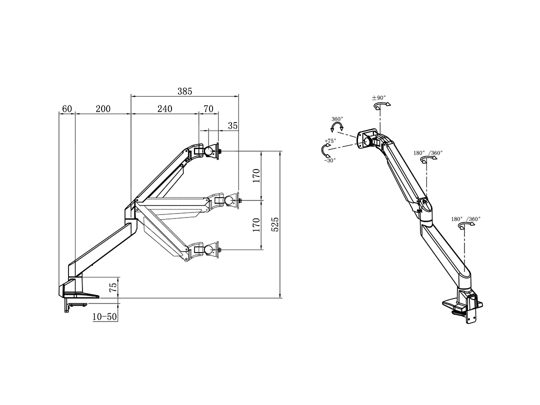 2 Arm 3 Gelenke, Höhe 185-525 mm,Hub 170 mm