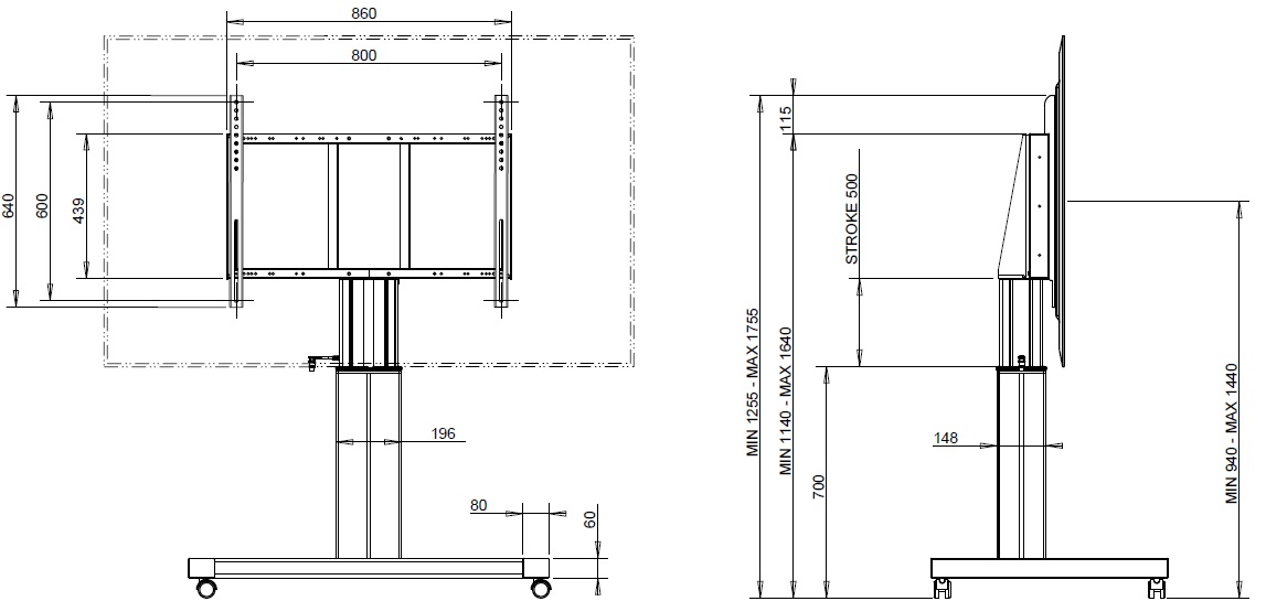 VESA 860x640, Hub 50cm, Höhe 1755 mm