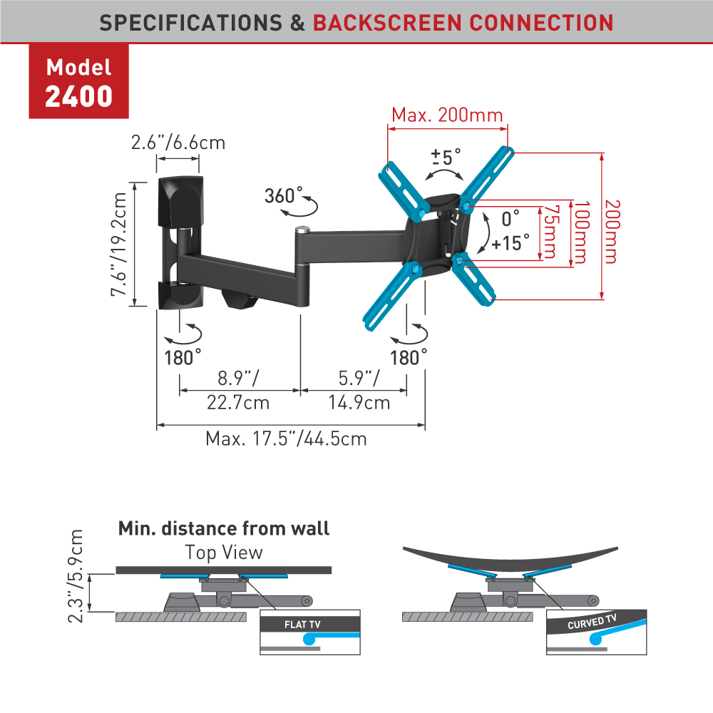 Für Curved und Flat TVs geeignet. 4 Gelenke,