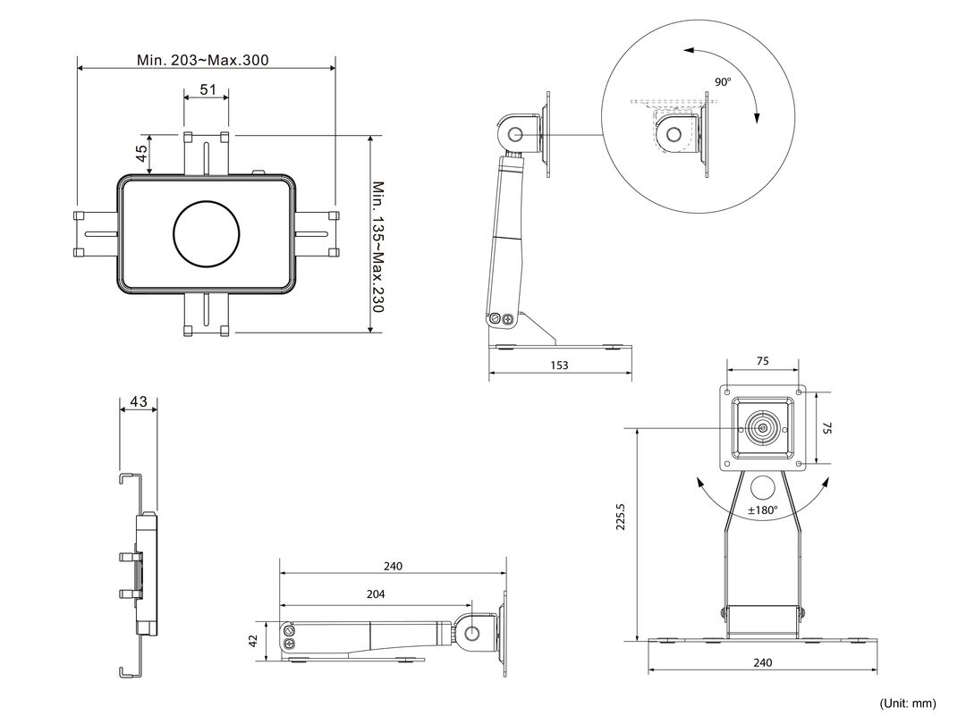 Vesa 75x75-100x100mm, Schwenkbar 360°